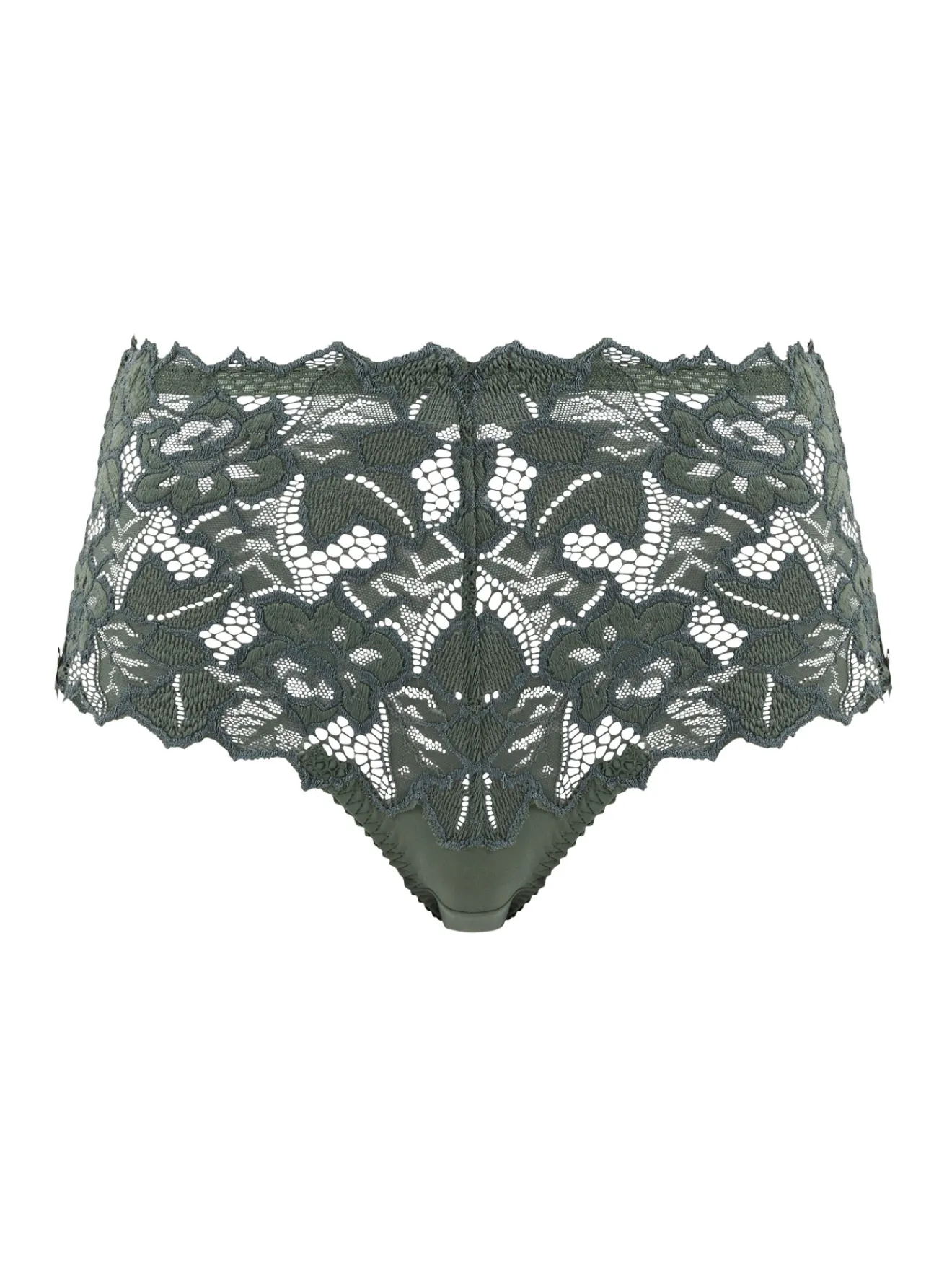 – Une large bande en dentelle florale textronic extensible aux finitions écailles recouvre les hanches à l’avant comme à l’arrière