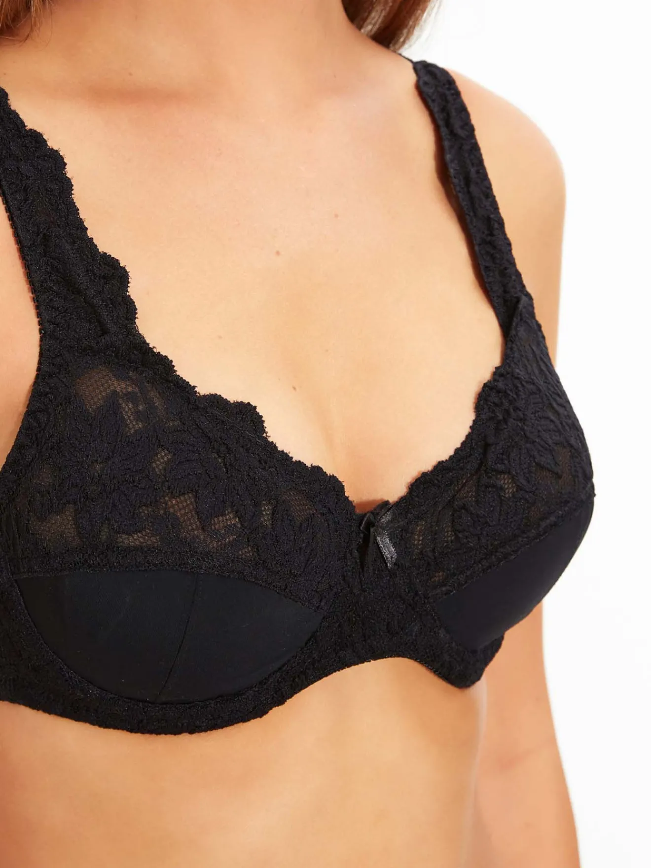 Bonnets 3 parties soulignés de dentelle dans le haut, sur les côtés et sur les bretelles réglables dos. Maille charmeuse dans le bas. Petit noeud à l’entre-bonnets. Double agrafage dos 3 positions.