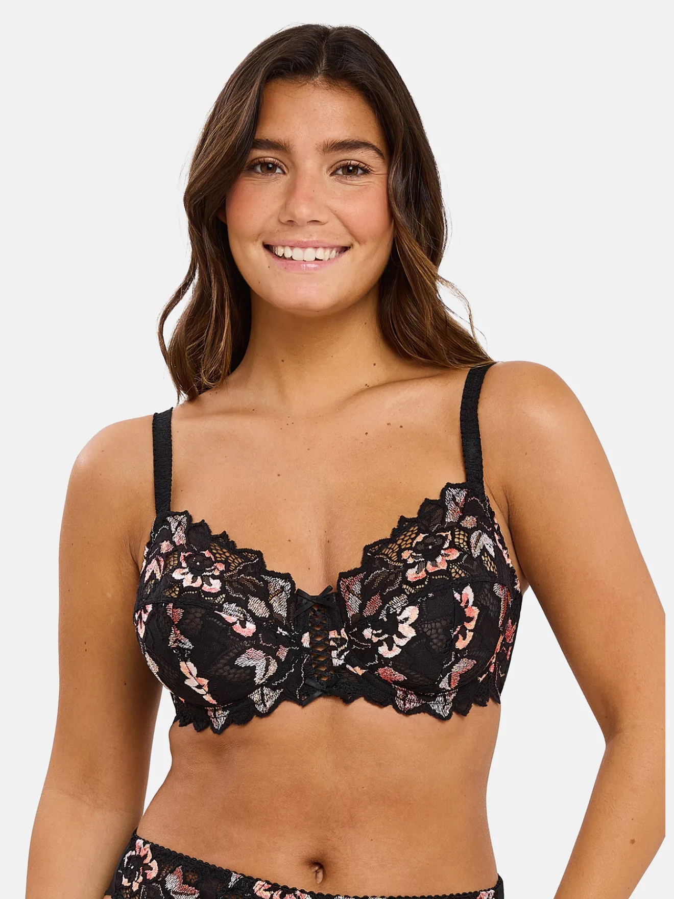 Dentelle 77% polyamide, 15% polyester, 8% élasthanne. Tissu 83% polyamide, 17% élasthanne. Doublure dos 89% polyamide, 11% élasthanne. Doublure 100% polyamide.