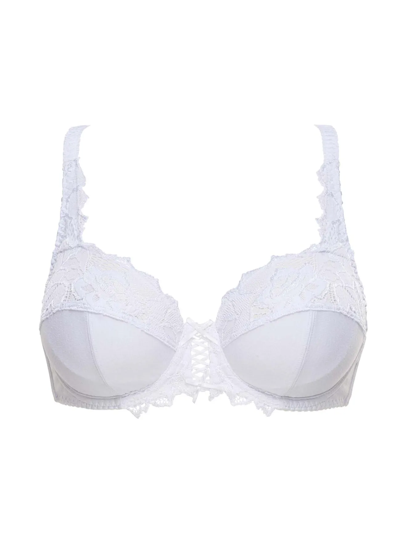 Soutien-gorge avec dentelle sur le haut des bonnets, en rappel aux bretelles réglables au dos. Laçage et noeuds fantaisie à l’entre-bonnets.