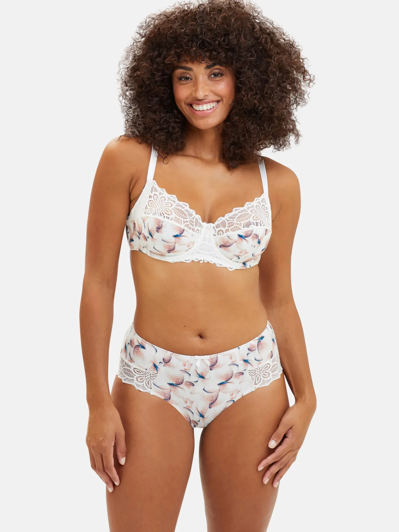 Du confort oui, mais pas sans une touche de fantaisie ! Ce soutien-gorge avec armatures SANS COMPLEXE se compose d’une belle dentelle florale sur les hauts bonnets et au séparateur, et d’un coton, imprimé, ultra doux, issu de l’agriculture biologique