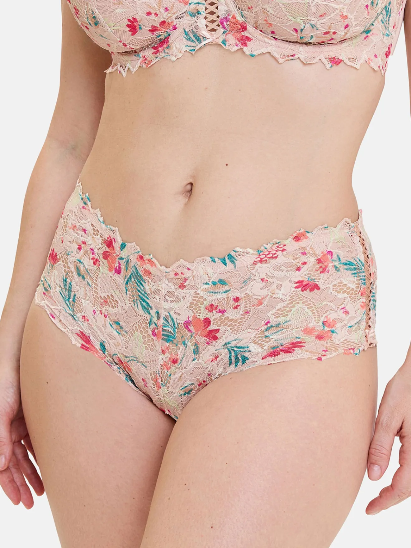 – Large bande en dentelle extensible imprimée aux motifs floraux ou graphique sur les hanches: confort et maintien