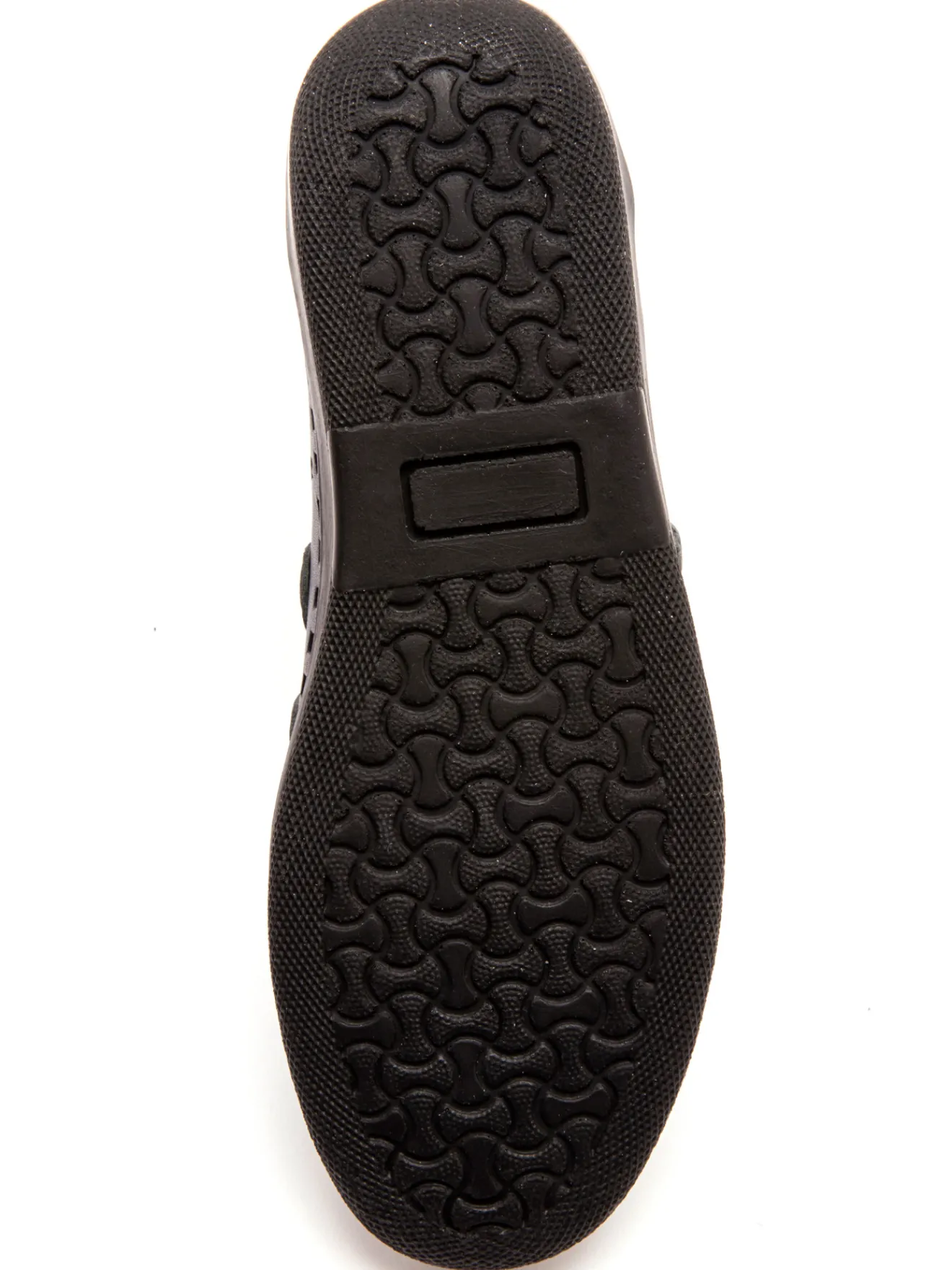 Dessus : cuir pleine fleur avec perforations fantaisie. Fermeture par double patte auto-agrippante (large ouverture et ajustement sur mesure au cou-de-pied). Doublure : synthétique. Semelle intérieure : cuir sur mousse, amovible pour y glisser notre propre semelle. Semelle : polyuréthane ultra légère.