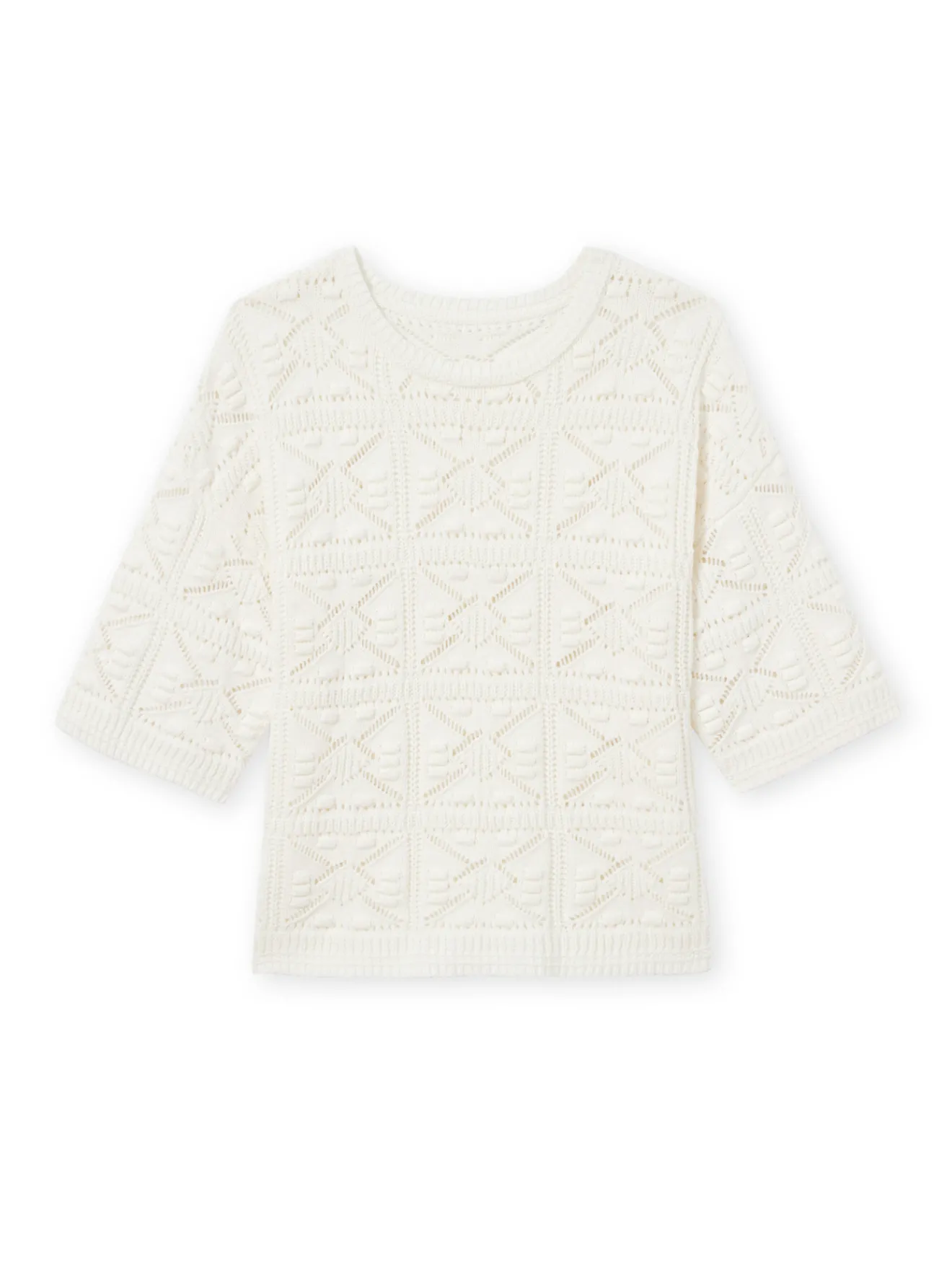 Un volume « boîte » très sympa qui vous permet de porter ce pull façon crochet qui dessine une jolie silhouette. Un petit pull parfait pour les soirées fraîches de l’été.