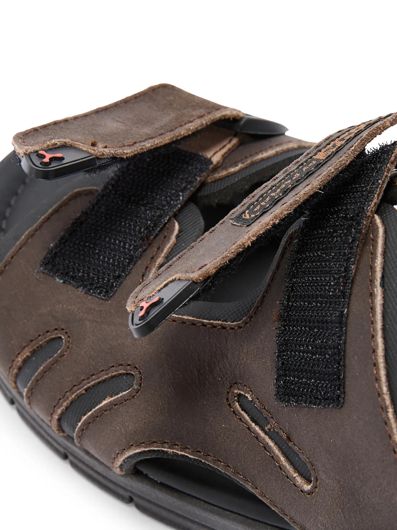 Dessus : cuir. Adaptation sur mesure à notre pied grâce aux pattes auto-agrippantes. Doublure : textile sur mousse. Semelle intérieure : cuir sur mousse épaisse (aérosemelle®). Semelle ultra légère : polyuréthane. Largeur : Large (G).