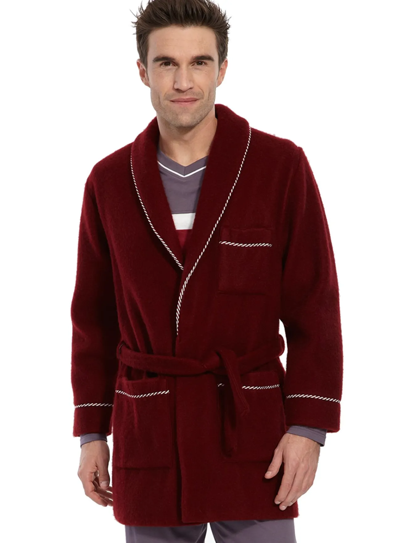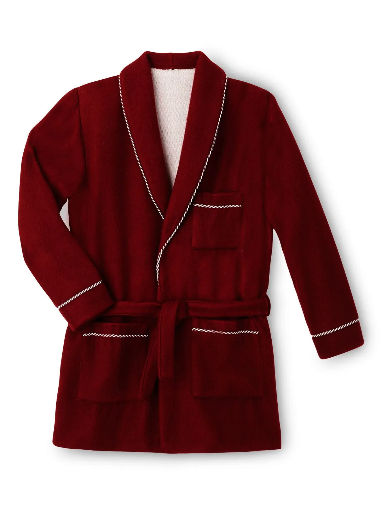 Col châle et bas des manches soulignés d’une ganse contrastante. 2 poches plaquées. Poche poitrine. Ceinture sous passants à nouer.