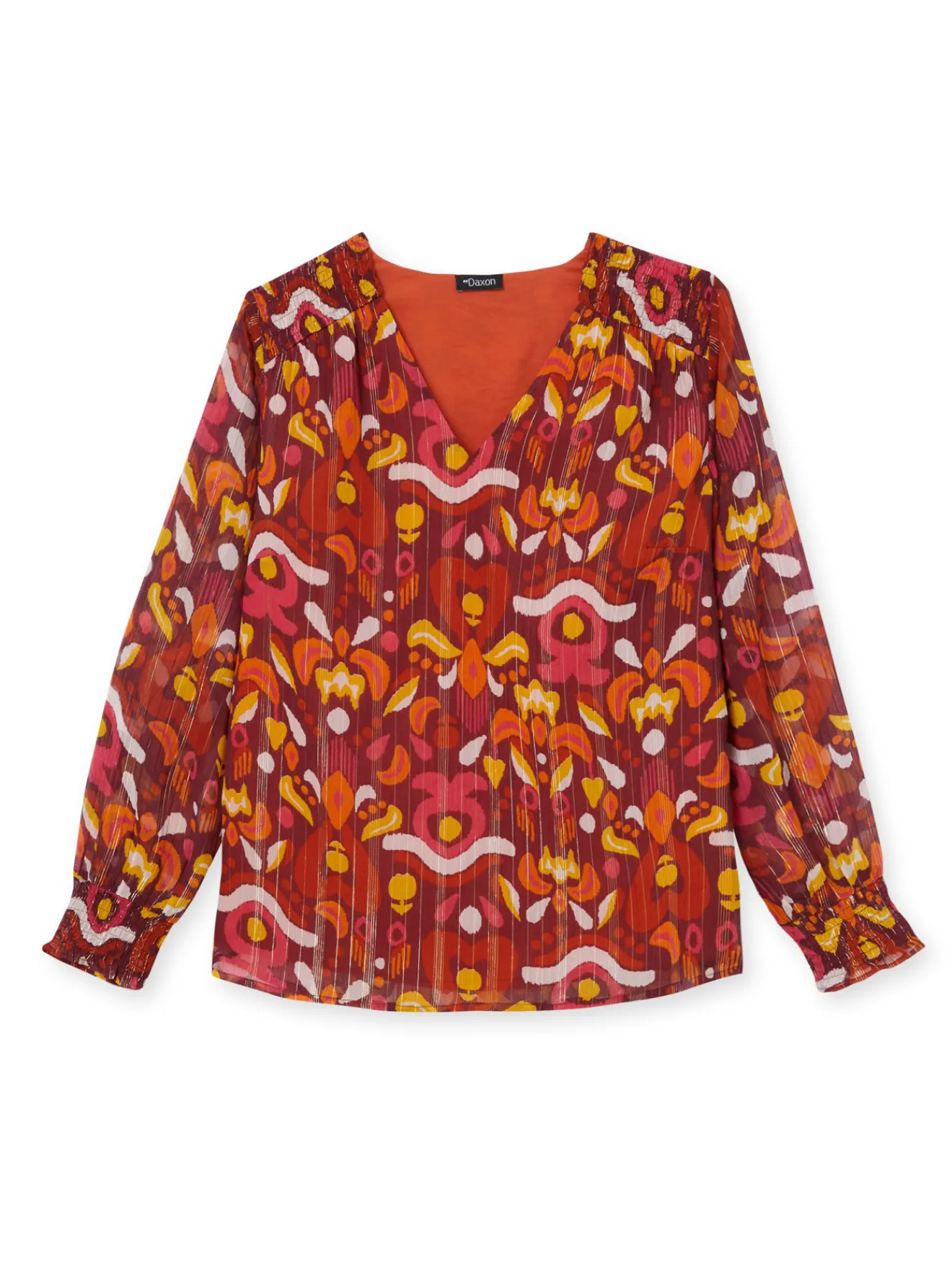 Des détails smocks aux épaules et aux poignets pour cette blouse imprimée : la petite touche d’originalité bienvenue. Idée look : jouer l’effet robe en l’associant à la jupe imprimée courte ou longue assortie !