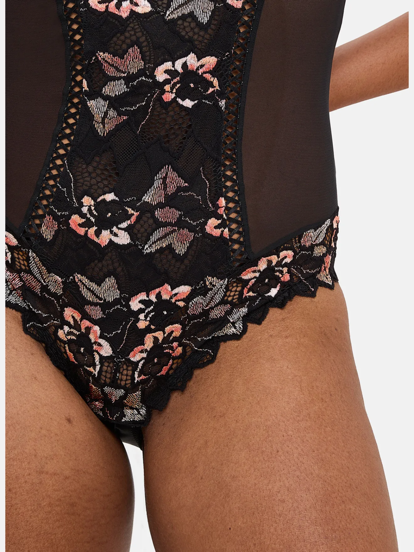 Dentelle 77% polyamide,15% polyester, 8% élasthanne. Tissu 83% polyamide, 17% élasthanne.