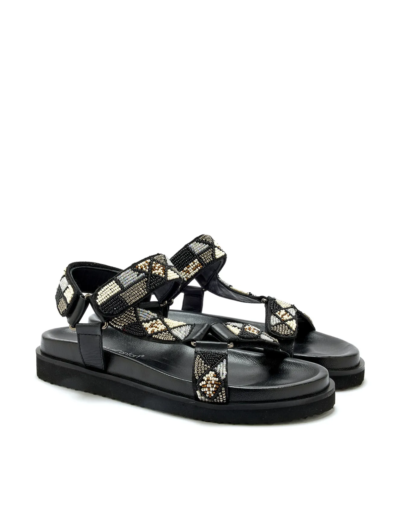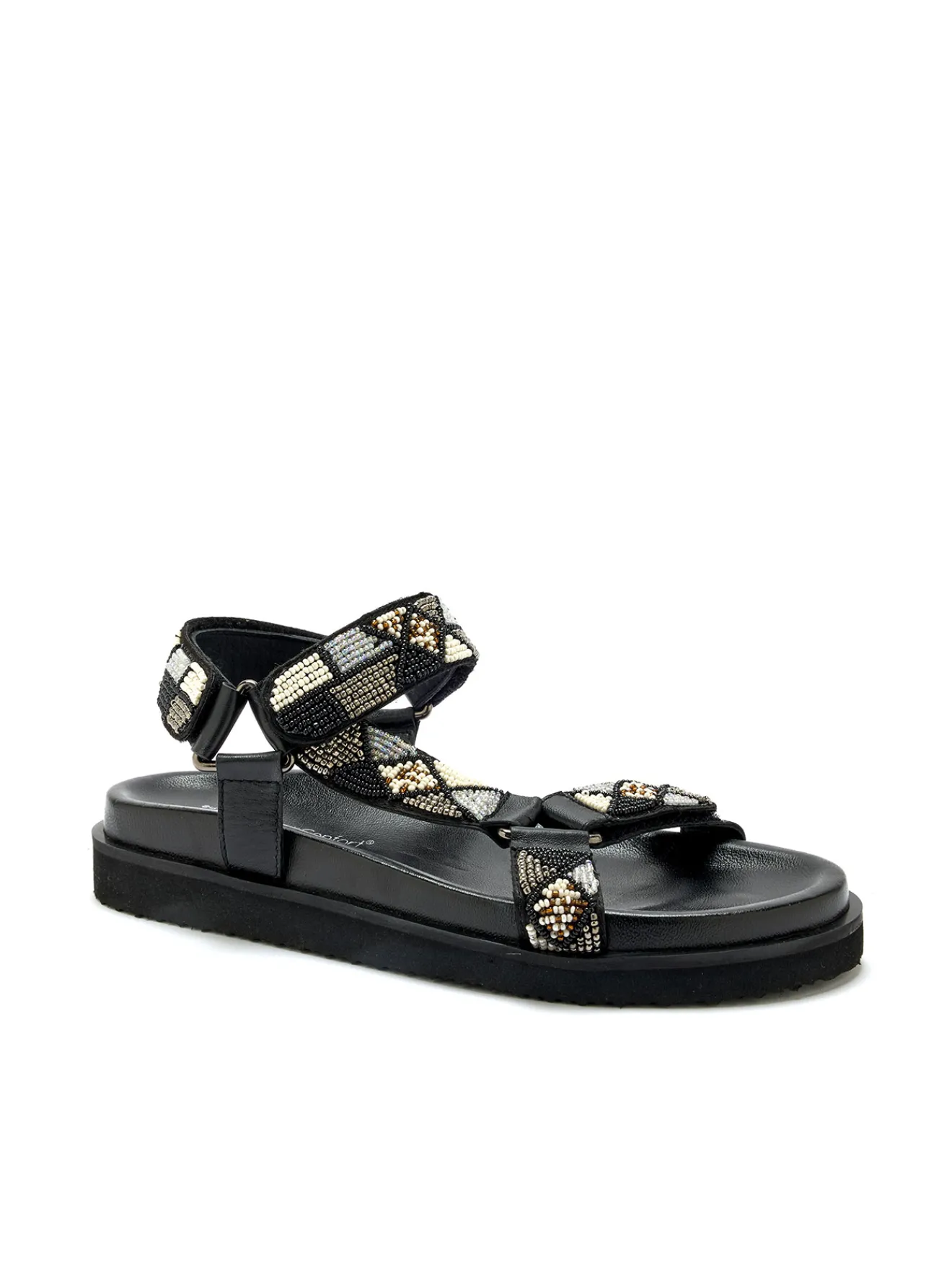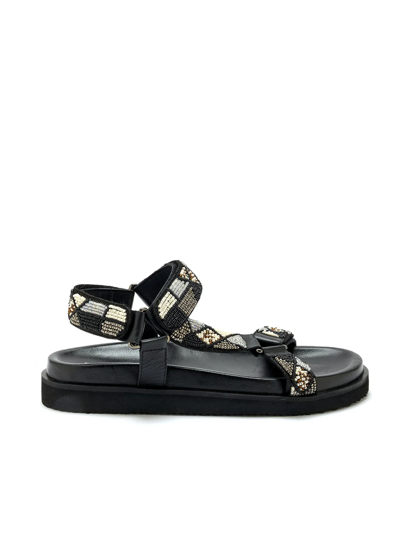 Toute l’originalité et le style de ces sandales en cuir s’exprime au travers de ses perles fantaisie : un détail qui en fait de petites pépites du dressing estival. Côté confort et praticité, ces sandales noires sont munies de 3 pattes scratch, pour une adaptation sur mesure au pied !