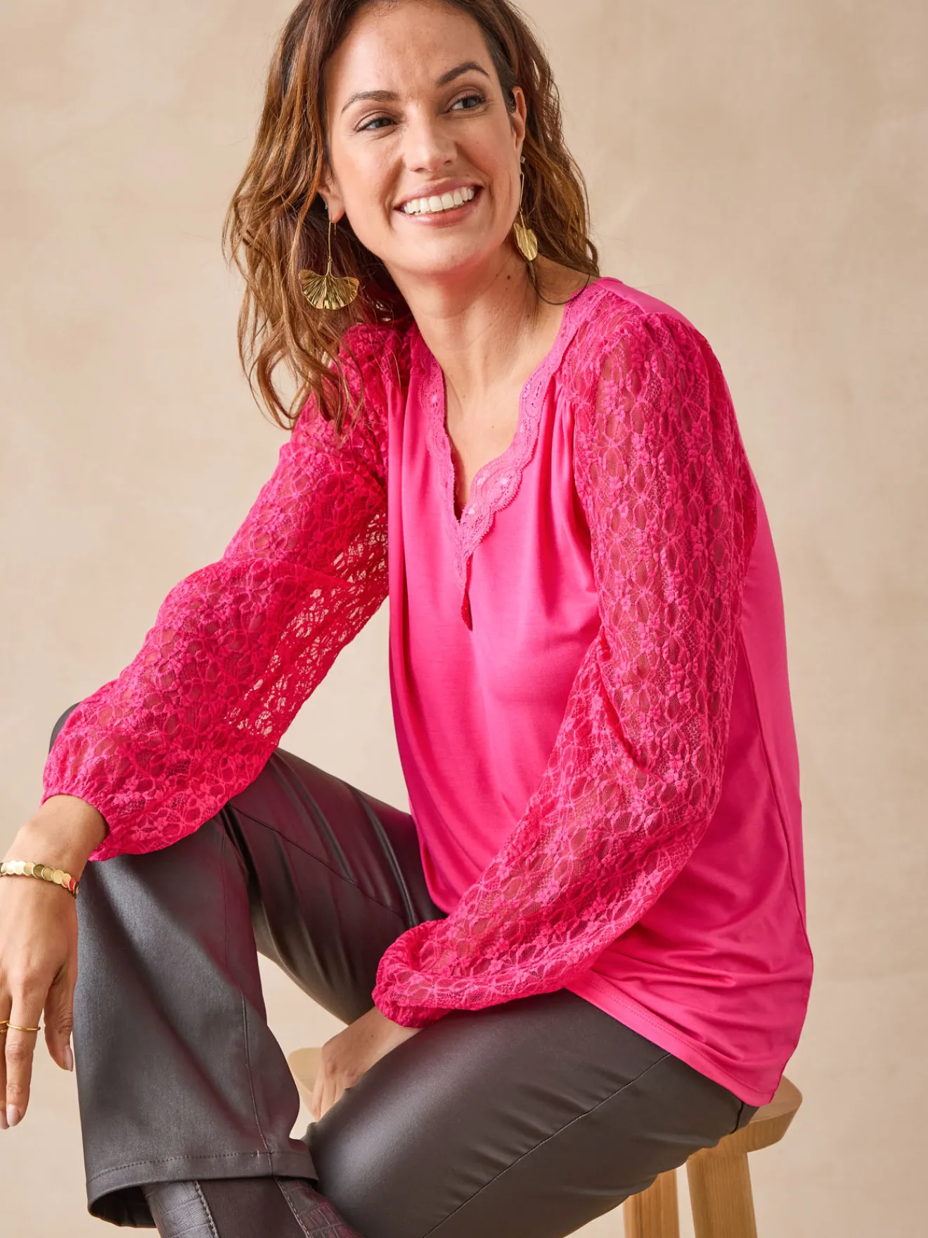 Ce T-shirt dentelle est conçu pour s’adapter à toutes les morphologies : petites et grandes tailles.