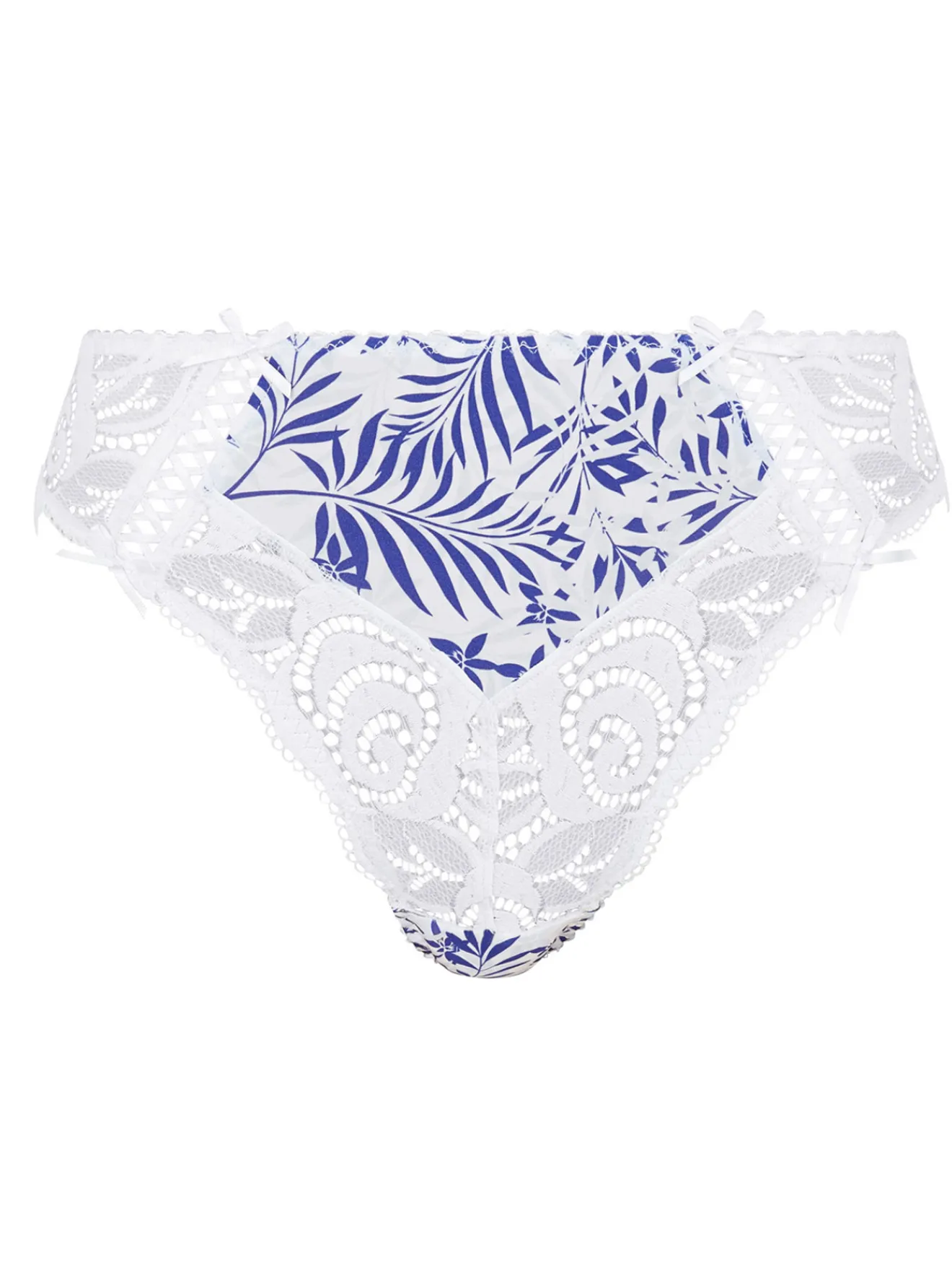 Culotte Amélie Print SANS COMPLEXE offrant une couvrance moyenne. Mix matières entre une dentelle extensible et une douce microfibre fantaisie très confortable. L’avant est principalement en dentelle, alors que l’arrière est entièrement en microfibre pour plus de confort et de douceur au porté. Petits noeuds et laçages fantaisie.
