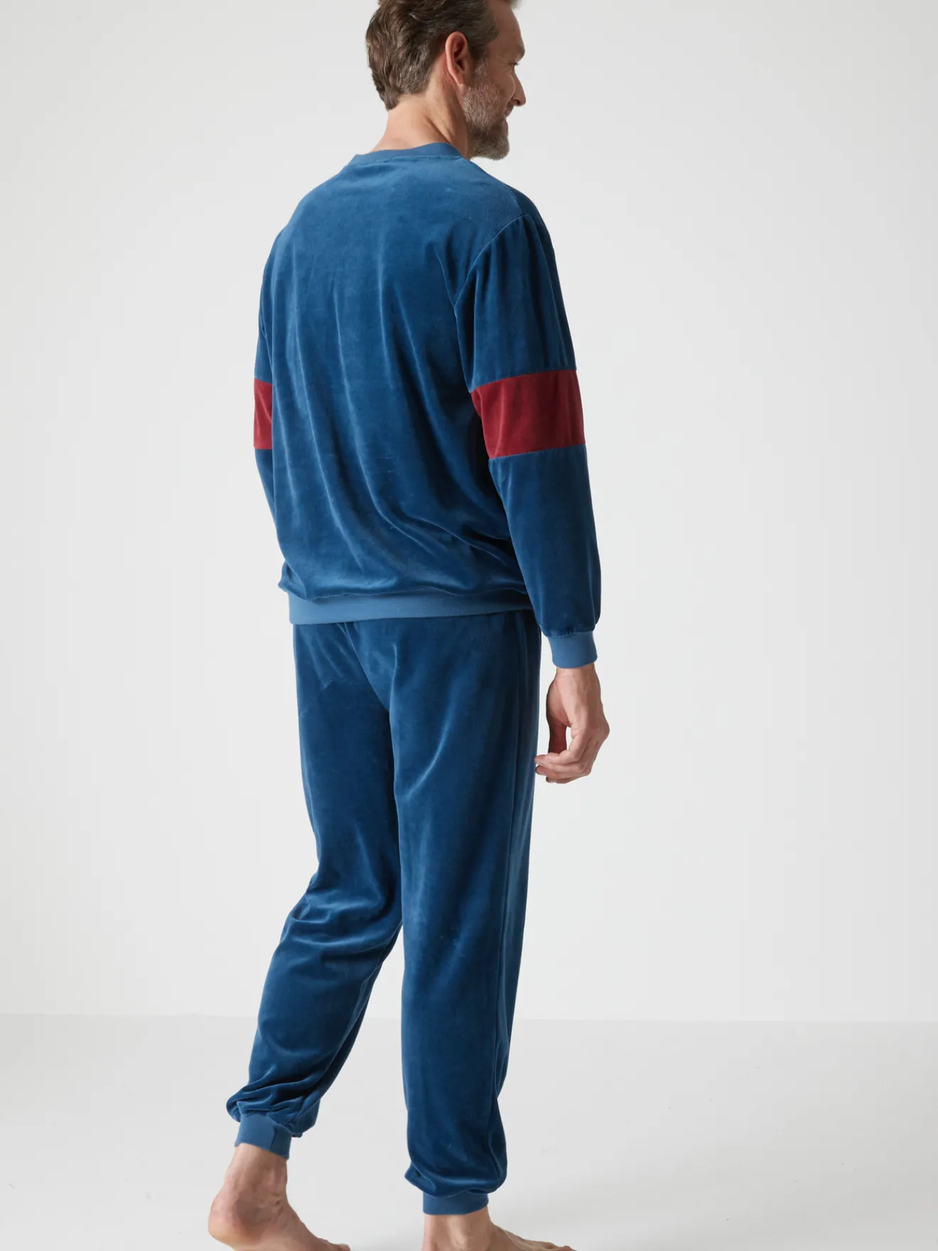 Le haut de pyjama : double bord-côtes à l’encolure ronde et au bas des manches longues. 2 bandes contrastantes sur le devant et une aux manches. Ecusson brodé contrastant sur la poitrine. Dos uni. Longueur 73 cm environ.