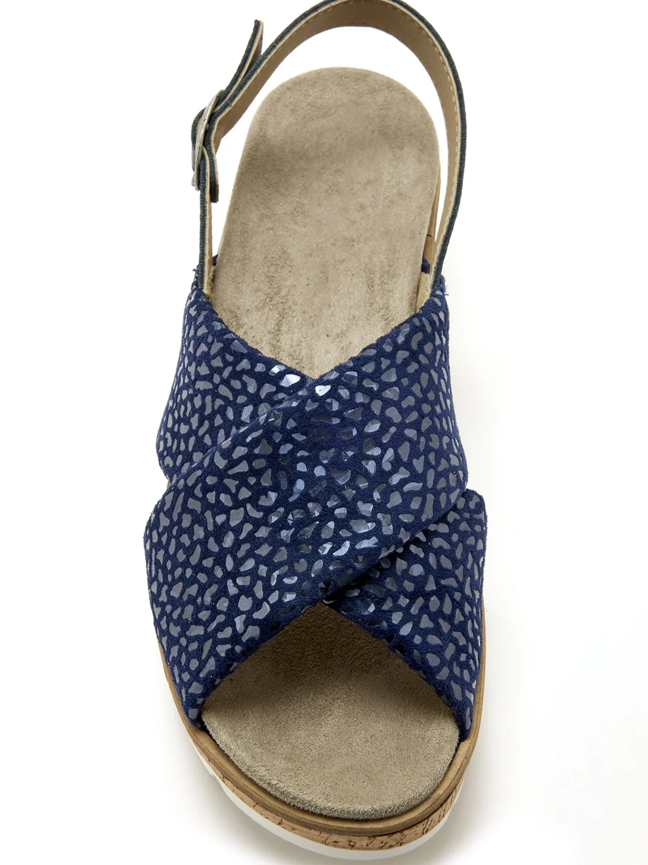 Alliance de confort et de fantaisie pour ces sandales PEDICONFORT®, grâce à leurs lanières croisées très confortables en matière extensible tubulaire, rehaussées de petits motifs brillants.