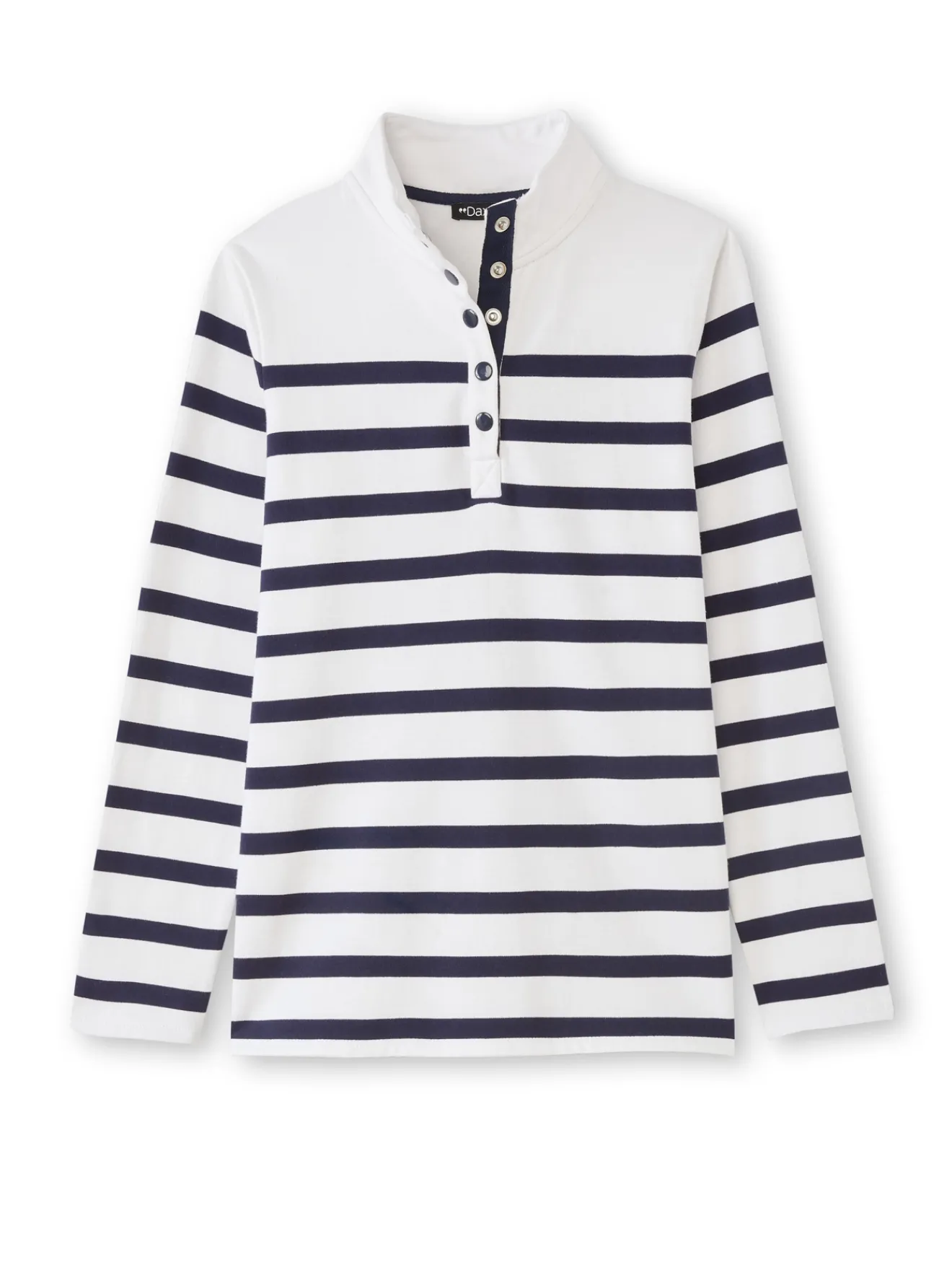 Esprit marinière pour ce sweat-shirt rayé. A associer à un jean ou un pantalon de jogging pour une allure sport chic.