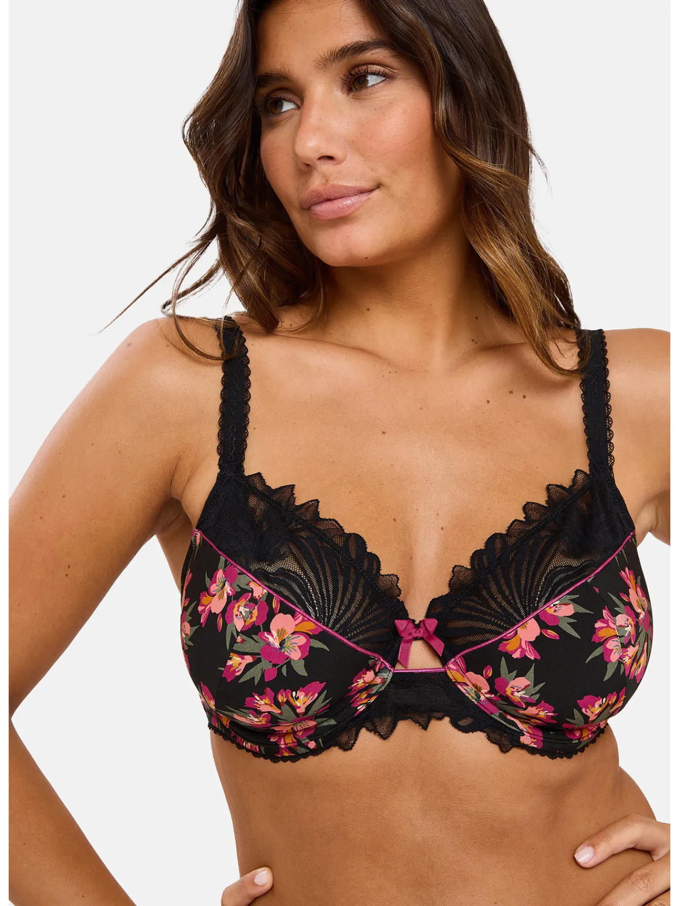 Découvrez le soutien-gorge Oriane SANS COMPEXE, la fusion parfaite entre dentelle délicate et microfibre imprimée au motif floral.