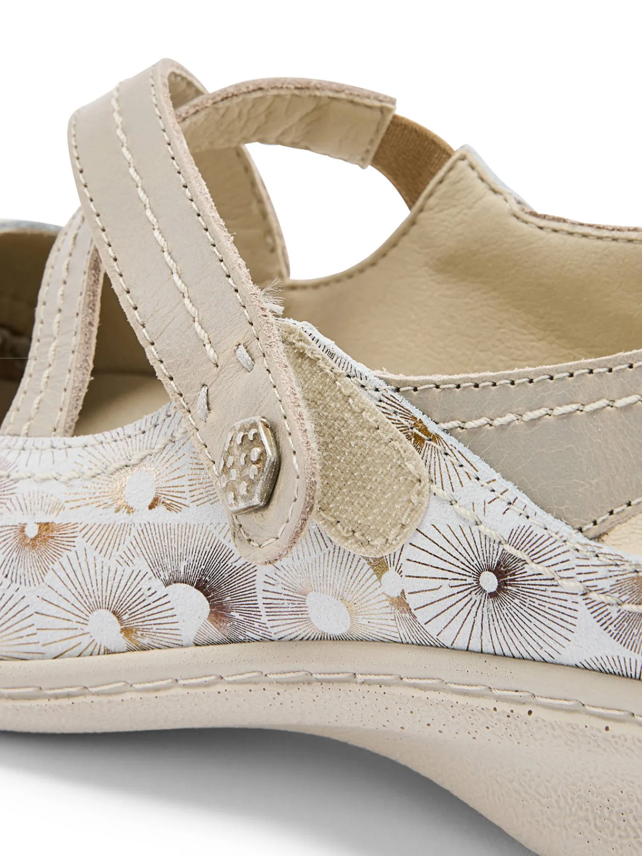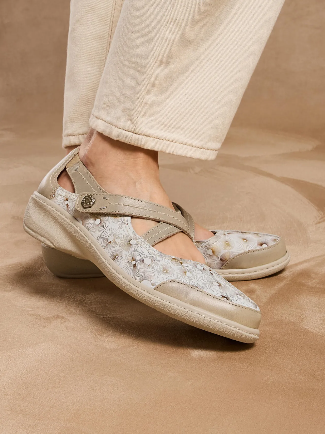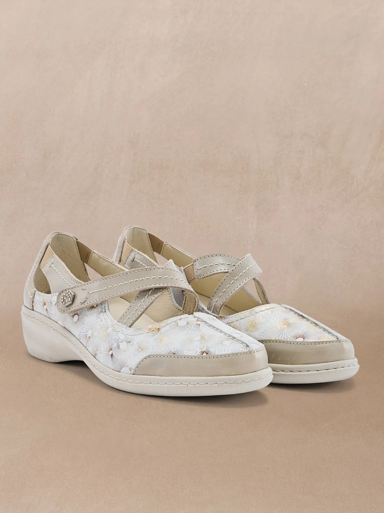 Originalité d’un dessus cuir imprimé pour ces babies PEDICONFORT® munies de 2 brides croisées : l’une fermée par scratch et l’autre munie d’un élastique d’aisance. Confort et facilité d’enfilage assurés !