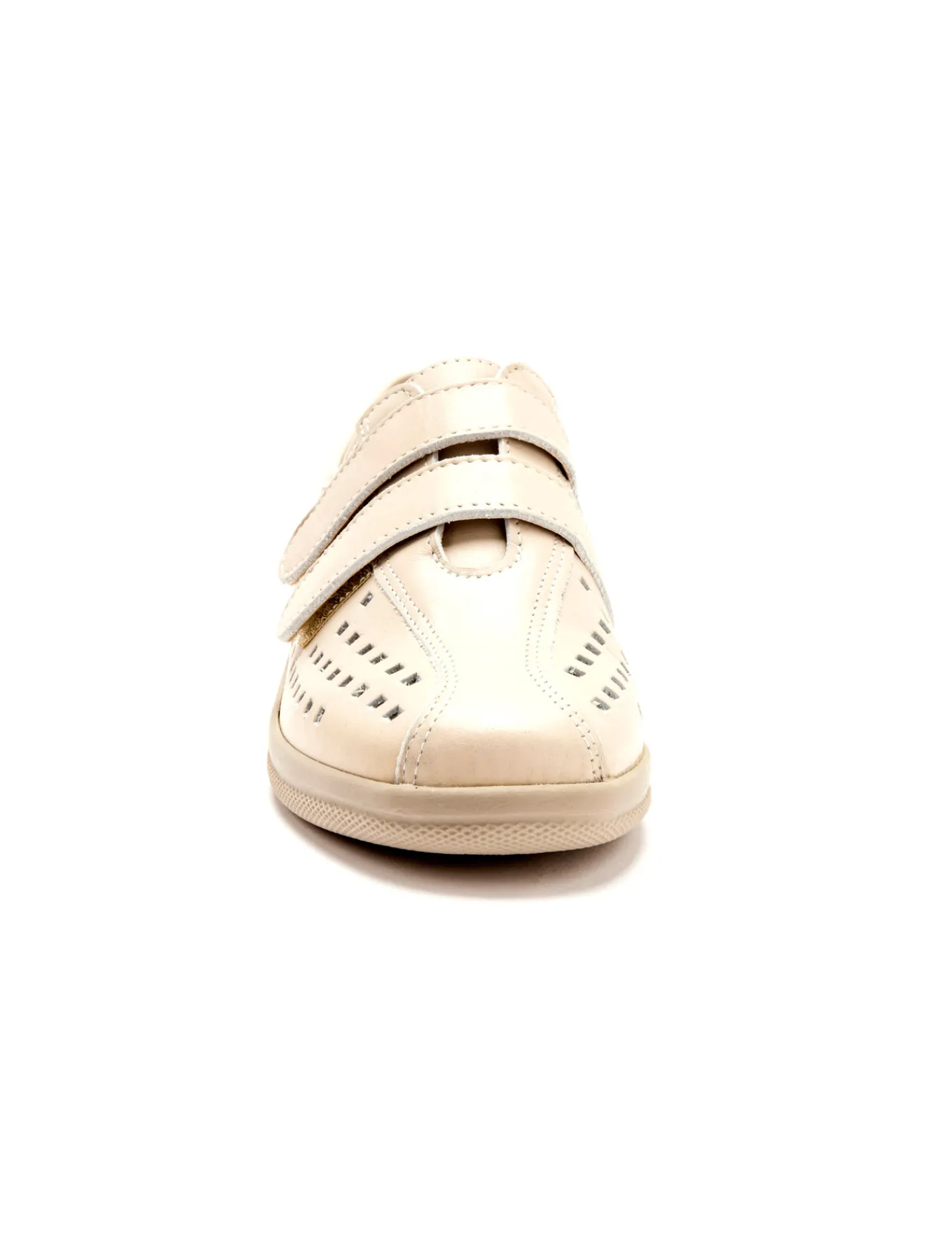 Dessus : cuir pleine fleur avec perforations fantaisie. Fermeture par double patte auto-agrippante (large ouverture et ajustement sur mesure au cou-de-pied). Doublure : synthétique. Semelle intérieure : cuir sur mousse, amovible pour y glisser notre propre semelle. Semelle : polyuréthane ultra légère.