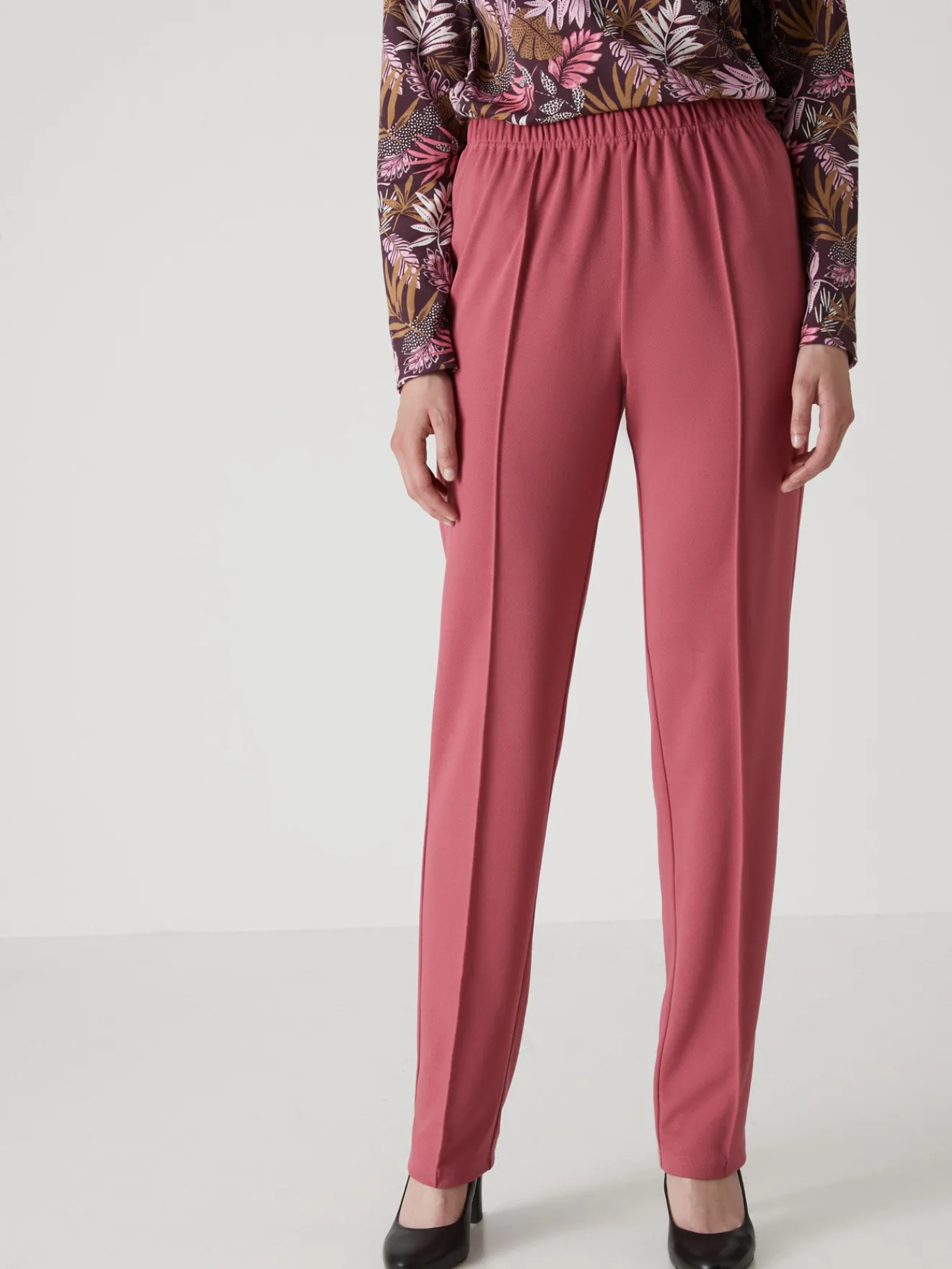 Taille entièrement élastiquée. Pli nervuré devant, permanent au dos.