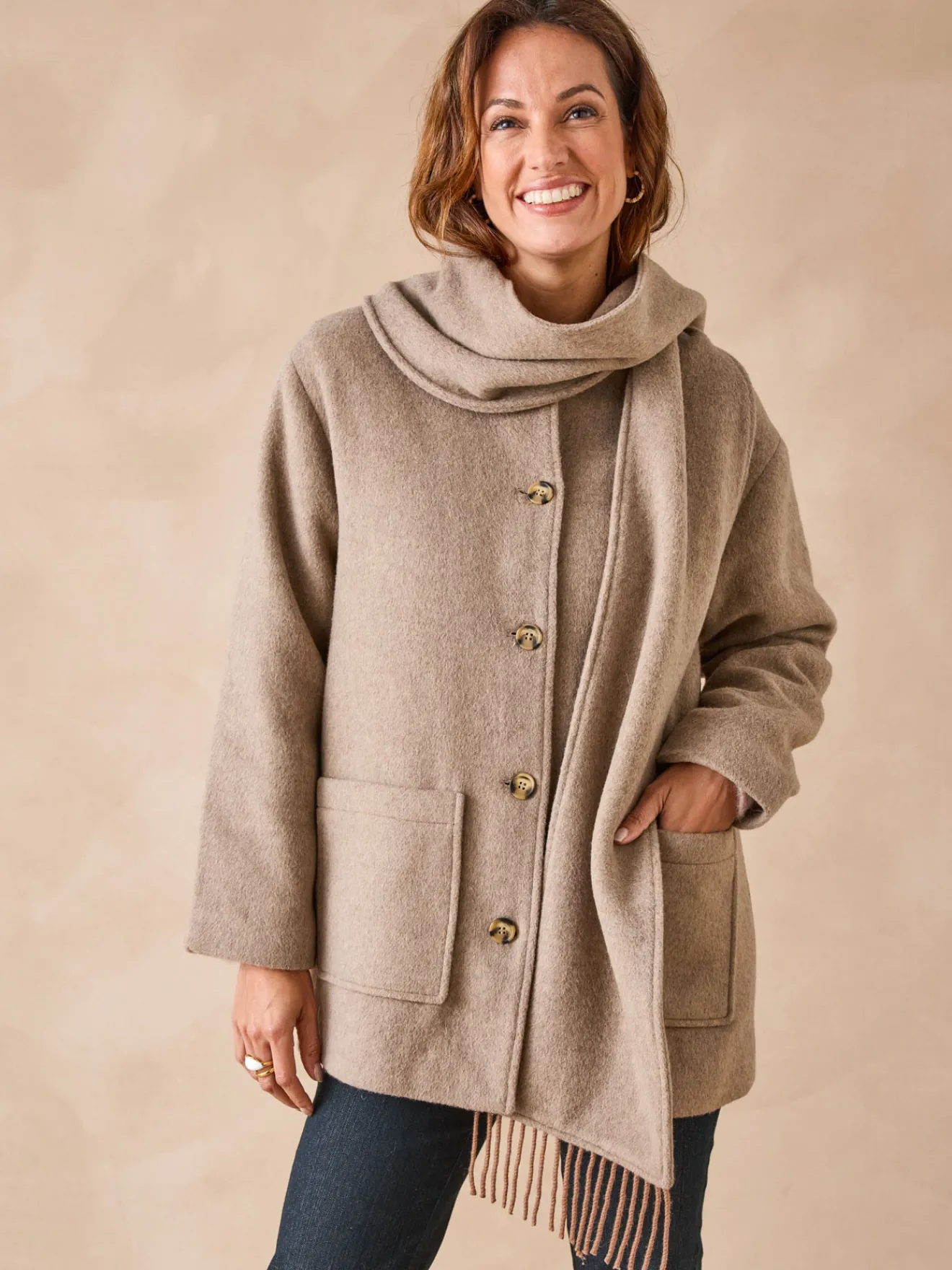 Avec ses 30% de laine, ce manteau beige est le complice idéal de votre hiver. On apprécie sa coupe un peu ample, pour un confort au top. Et le petit plus : il est livré avec une écharpe amovible coordonnée.