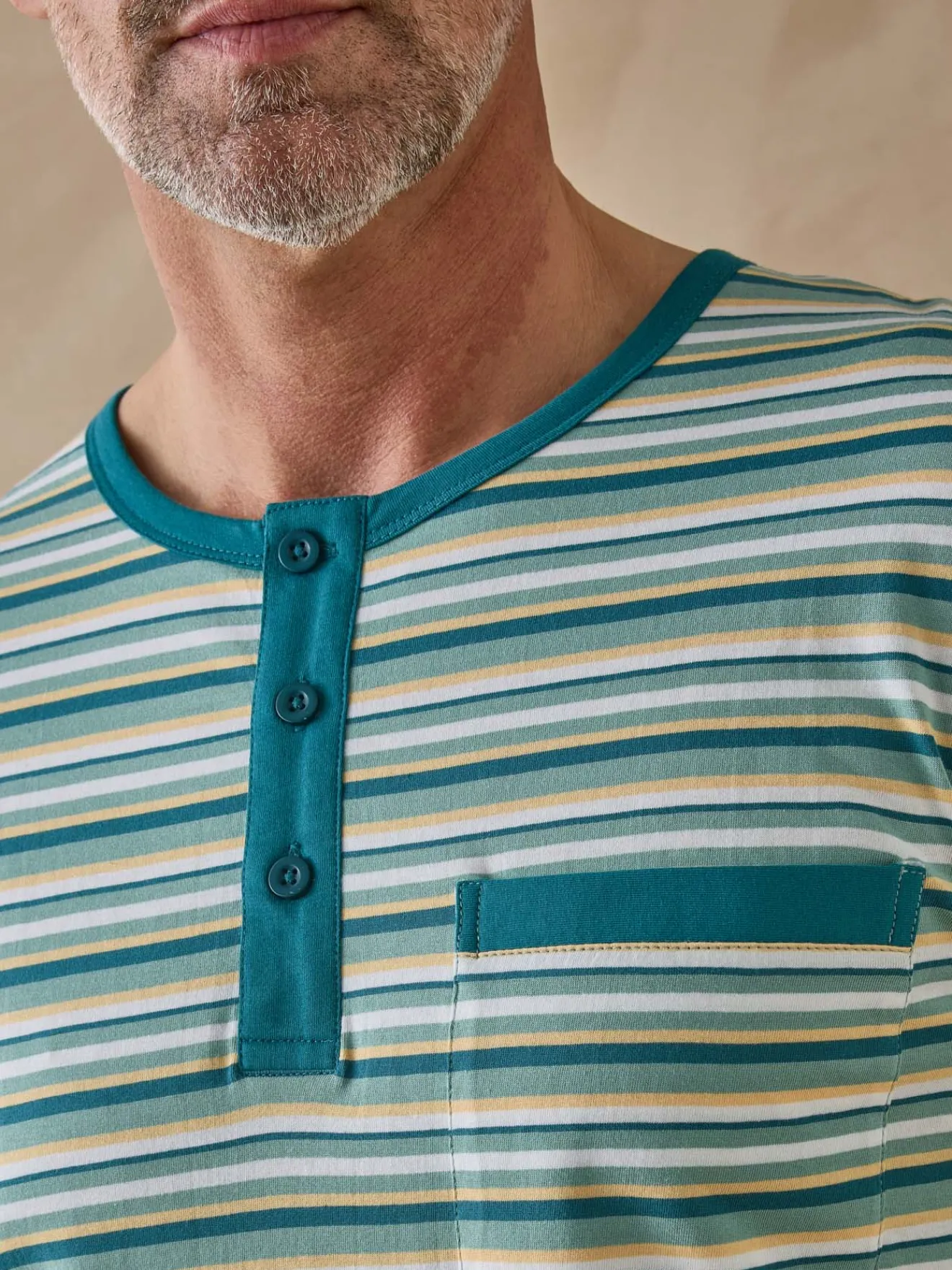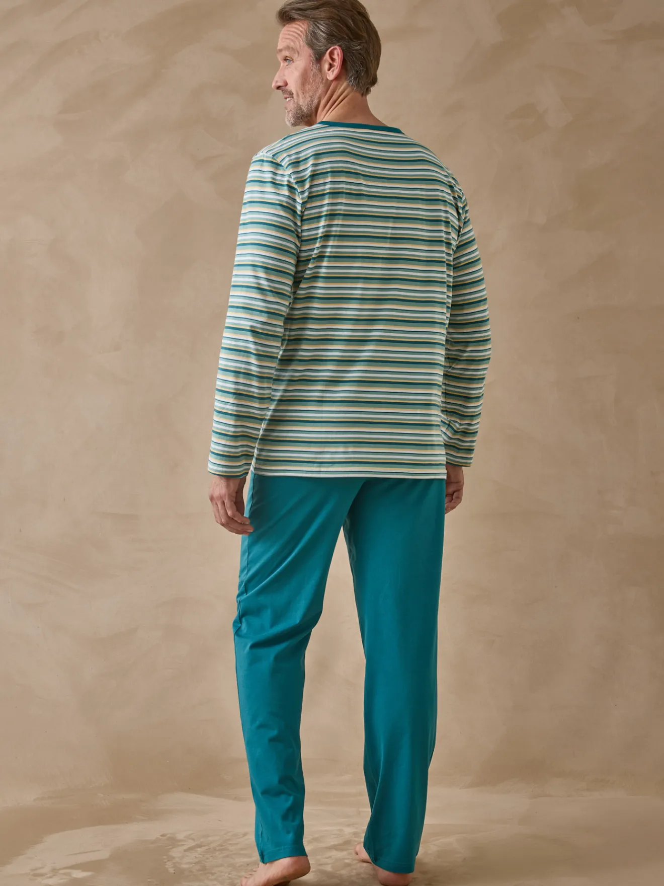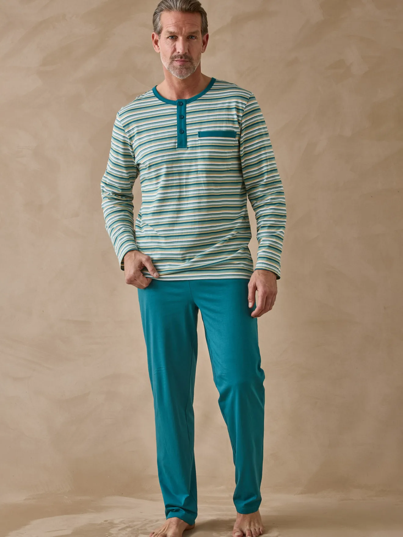 Le confort d’une maille jersey 100% coton pour ce pyjama qui adopte tout naturellement une jolie tonalité de vert, sans oublier la touche de fantaisie avec les rayures !