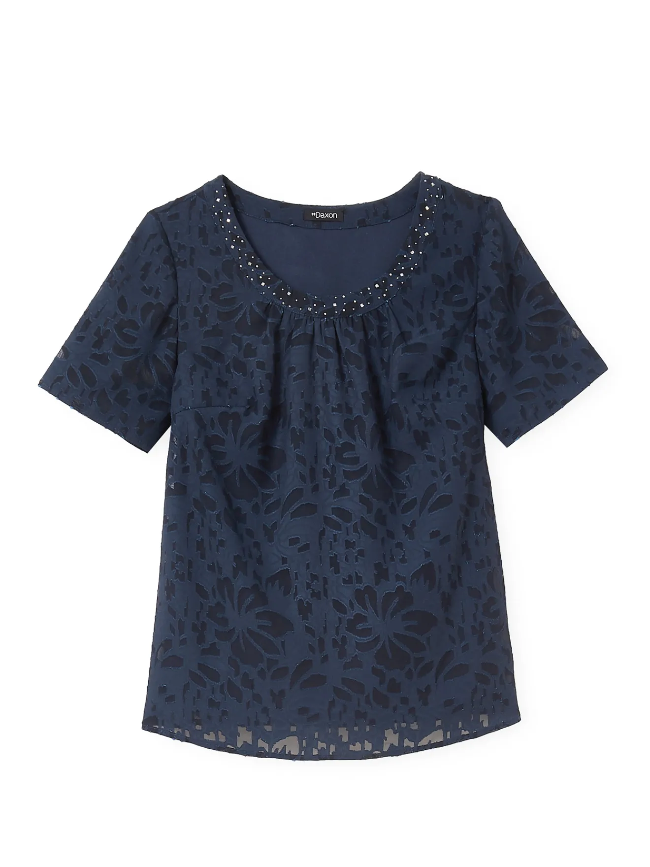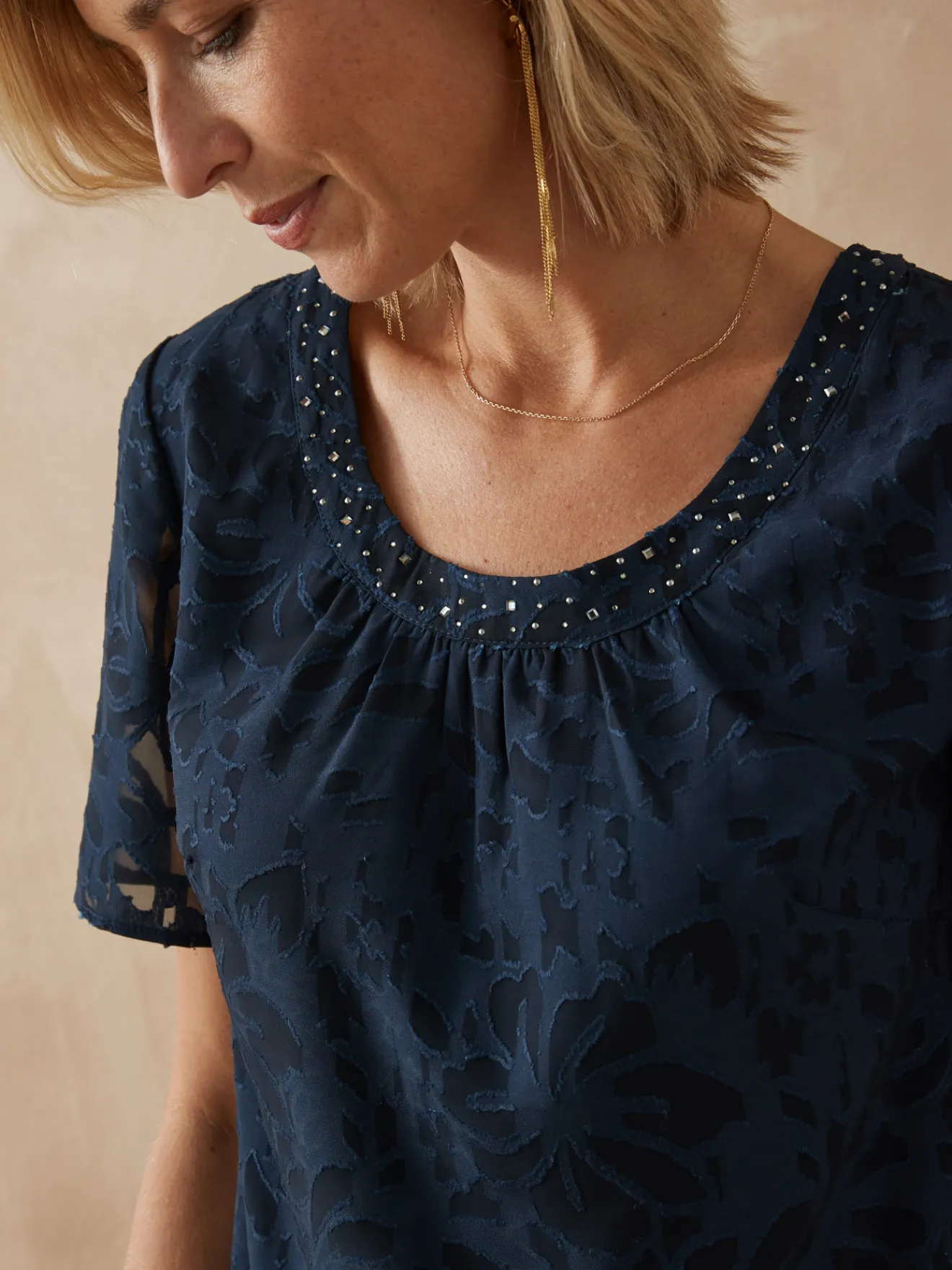 Une blouse manches courtes qui adopte les bons codes pour s’inviter dans nos fêtes et cérémonies : le chic d’un coloris marine, le raffinement de petits strass à l’encolure, l’originalité d’un tissu dévoré et l’élégance d »une coupe évasée. Un bon pion !