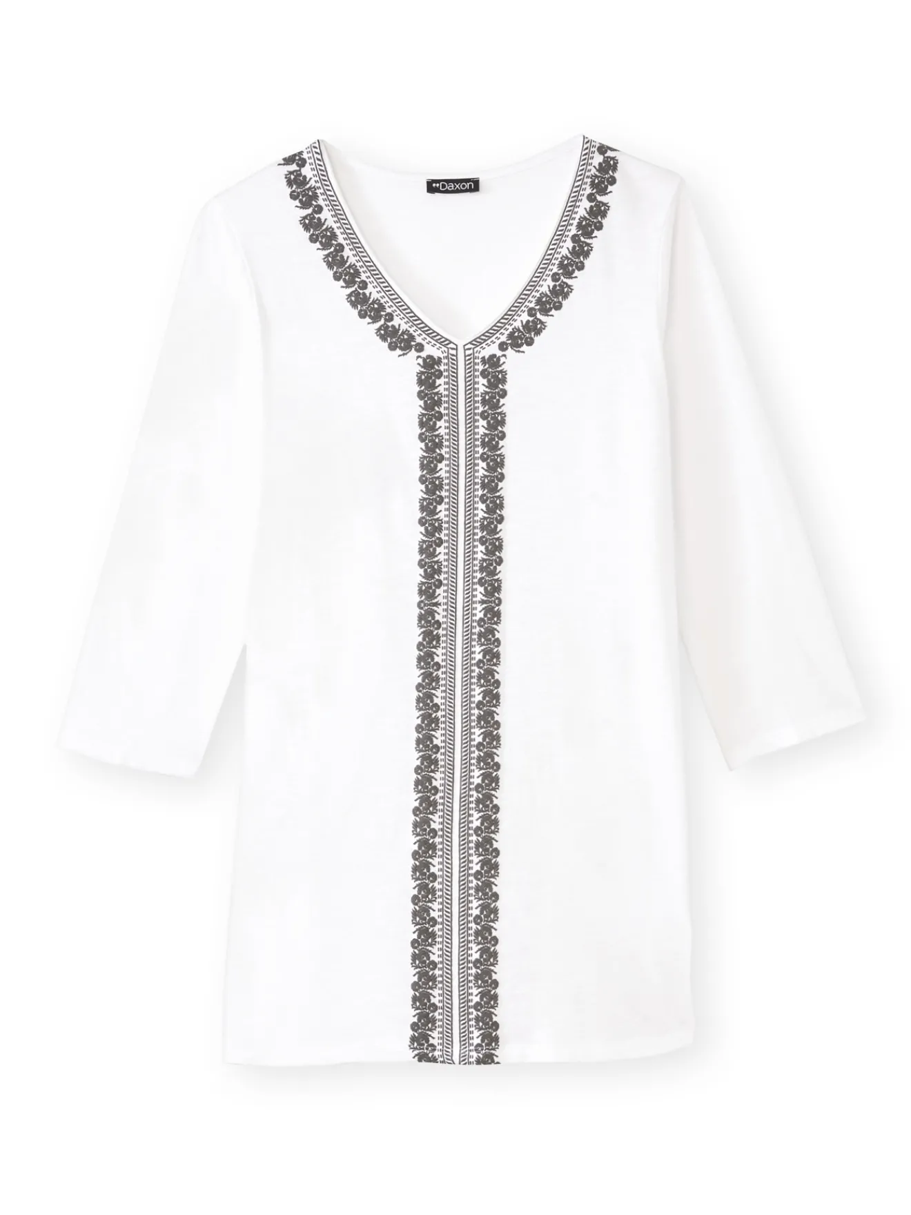 – Motif imprimé contrastant à l’encolure V et se prolongeant sur le milieu devant