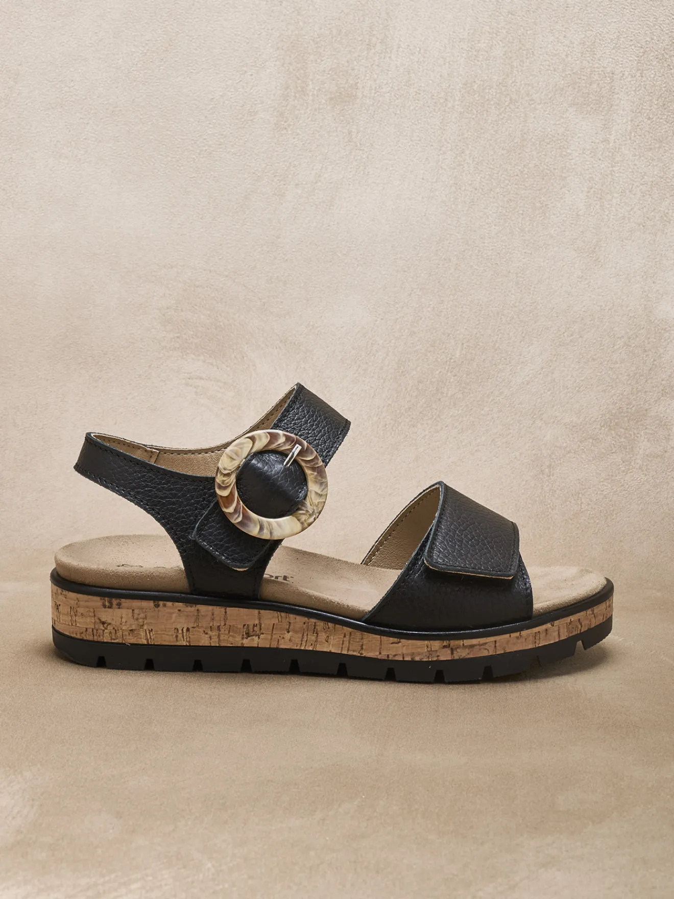 Une double patte scratch, dont l’une rehaussée avec style d’une boucle fantaisie : une double bonne raison d’opter pour ces sandales noires qui jouent aussi l’originalité d’une épaisse semelle compensée (la grande tendance !) avec effets de matières.