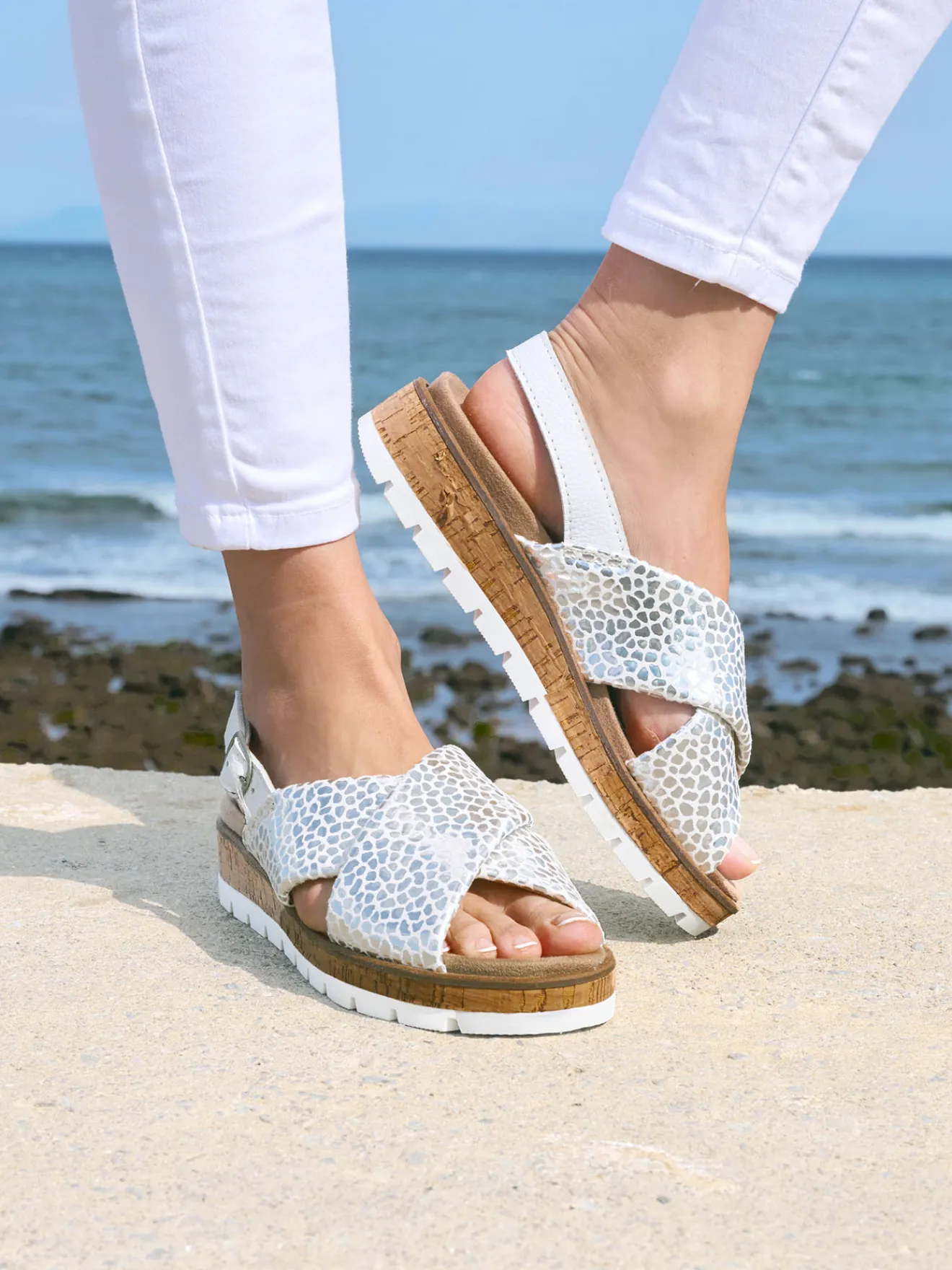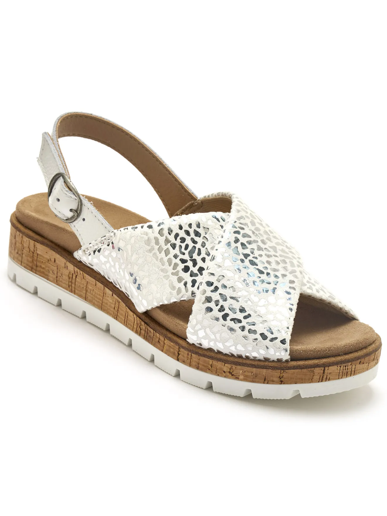 Alliance de confort et de fantaisie pour ces sandales PEDICONFORT®, grâce à leurs lanières croisées très confortables en matière extensible tubulaire, rehaussées de petits motifs brillants.